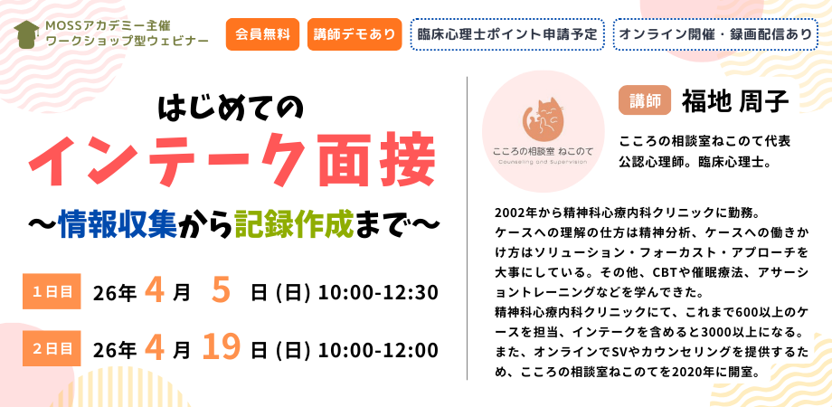 | 資格ポイント | 臨床心理士更新ポイント2条(4)項目(2ポイント)申請予定 |