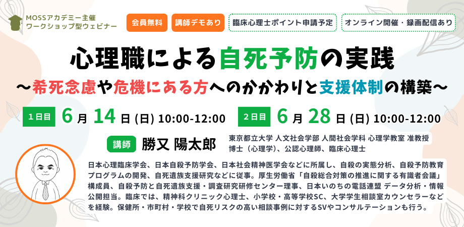 | 講師 | 勝又 陽太郎 氏(東京都立大学 人文社会学部 人間社会学科 心理学教室 准教授、博士(心理学)、公認心理師、臨床心理士) |