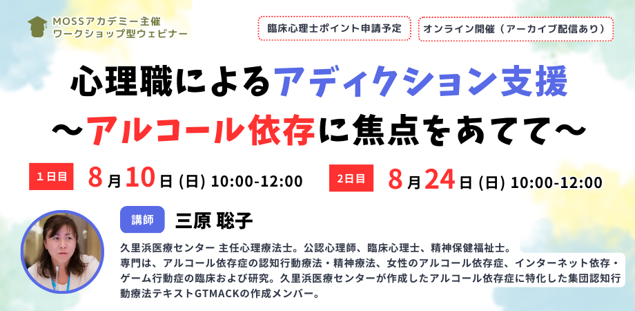 | 講師 | 三原 聡子 氏(国立病院機構久里浜医療センター 主任心理療法士、公認心理師、臨床心理士、精神保健福祉士) |