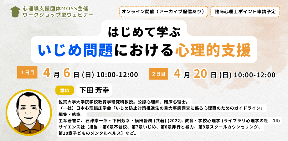 | 講師 | 下田 芳幸 氏(佐賀大学大学院学校教育学研究科(教職大学院)教授、公認心理師、臨床心理士) |