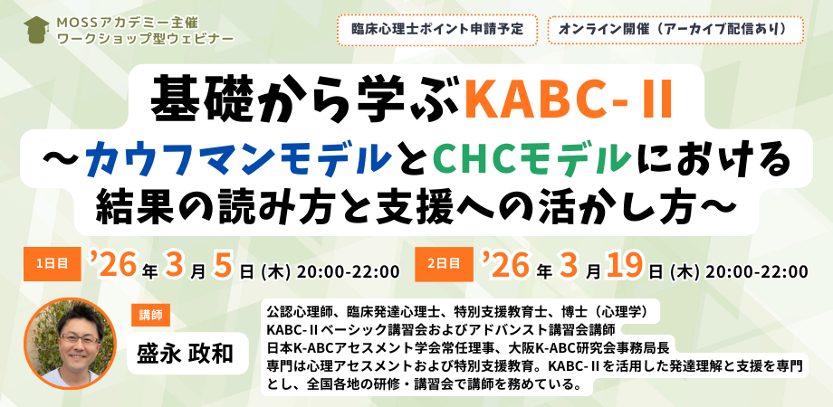 | 講師 | 盛永 政和 氏(公認心理師・臨床発達心理士・特別支援教育士。博士(心理学)。KABC-Ⅱベーシック講習会およびアドバンスト講習会講師。日本K-ABCアセスメント学会常任理事、大阪K-ABC研究会事務局長。) |